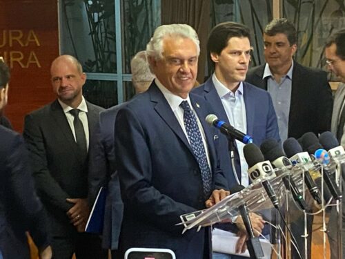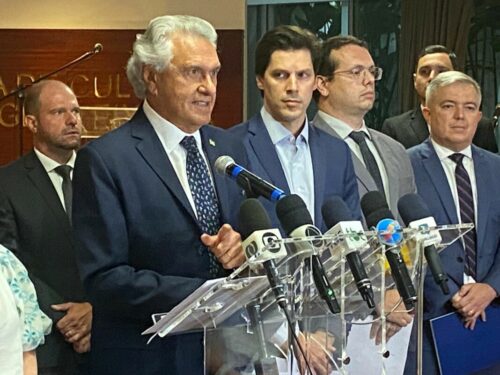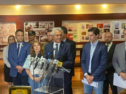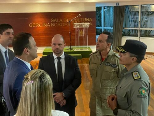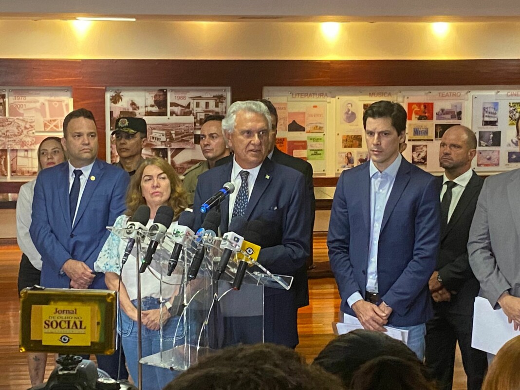 O delegado-geral da Polícia Civil de Goiás, André Corteze Ganga, participou, na tarde desta sexta-feira (14/4), de entrevista coletiva à imprensa na qual o governador Ronaldo Caiado apresentou projeto de lei que institui a Política Estadual de Prevenção e Combate à Violência Escolar. O evento aconteceu no salão Dona Gercina, no Palácio das Esmeraldas. O projeto de lei lançado visa evitar atos de violência no ambiente escolar, sobretudo ameaças potencialmente planejadas e executadas dentro das escolas, contra professores e alunos. Participaram da coletiva várias autoridades, entre as quais o secretário de Segurança Pública, Renato Brum, os comandantes dos Bombeiros, Polícia Militar, Polícia Penal e outros.