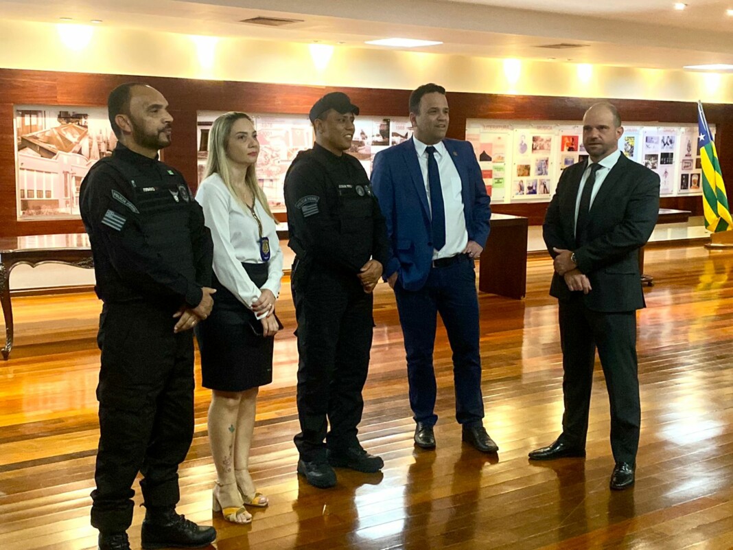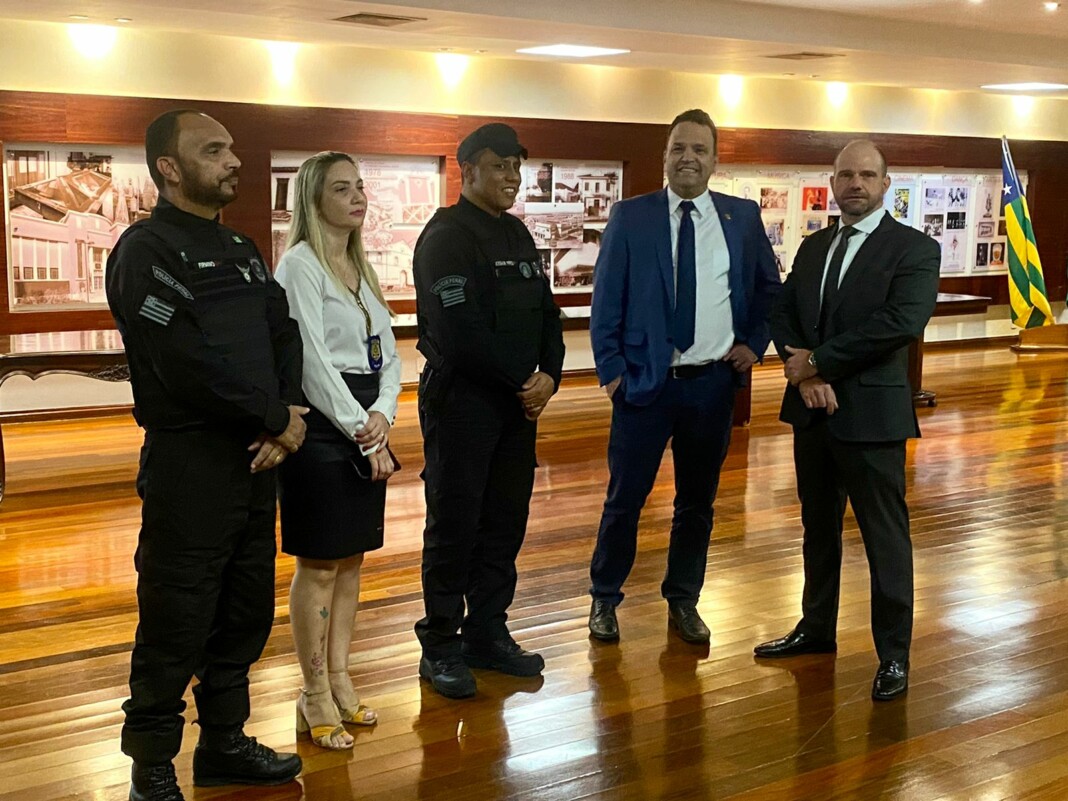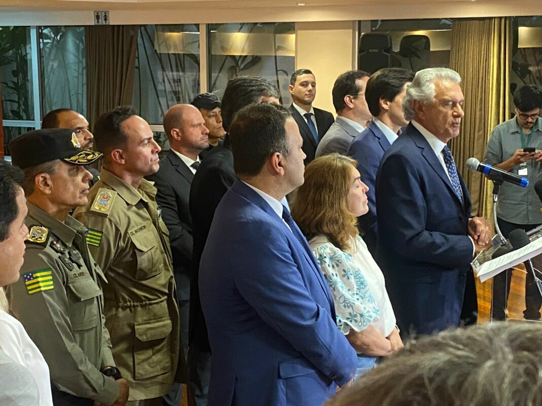 O delegado-geral da Polícia Civil de Goiás, André Corteze Ganga, participou, na tarde desta sexta-feira (14/4), de entrevista coletiva à imprensa na qual o governador Ronaldo Caiado apresentou projeto de lei que institui a Política Estadual de Prevenção e Combate à Violência Escolar. O evento aconteceu no salão Dona Gercina, no Palácio das Esmeraldas. O projeto de lei lançado visa evitar atos de violência no ambiente escolar, sobretudo ameaças potencialmente planejadas e executadas dentro das escolas, contra professores e alunos. Participaram da coletiva várias autoridades, entre as quais o secretário de Segurança Pública, Renato Brum, os comandantes dos Bombeiros, Polícia Militar, Polícia Penal e outros.