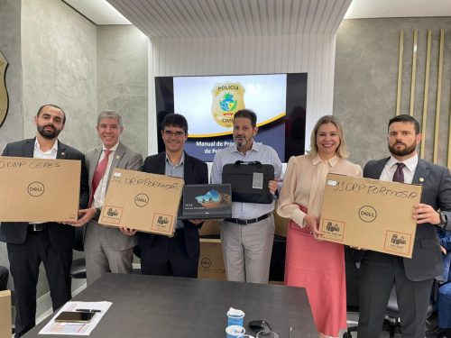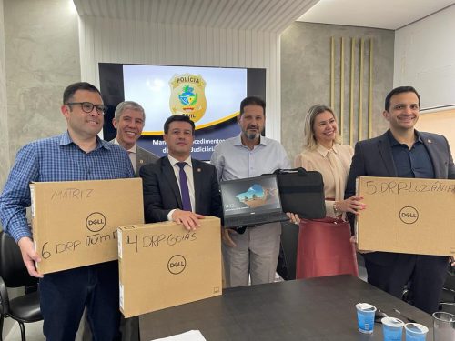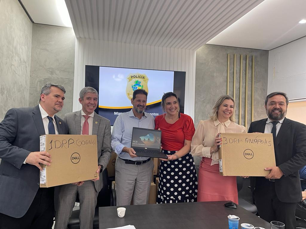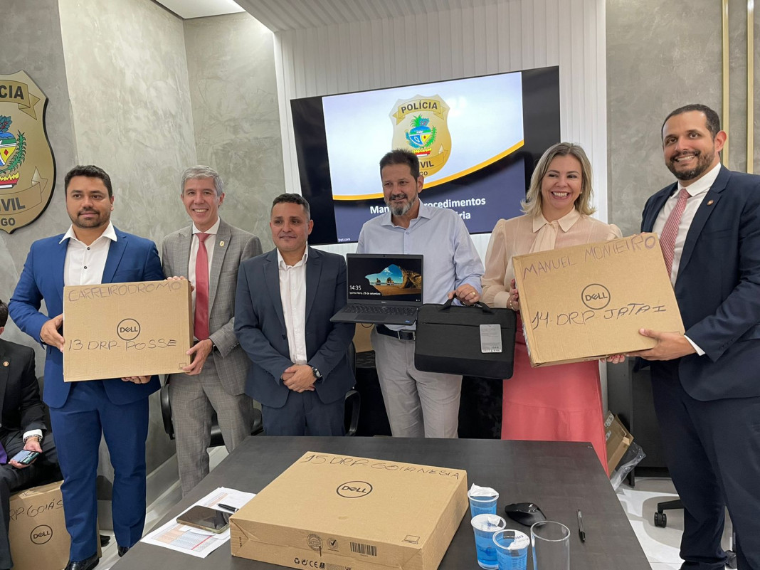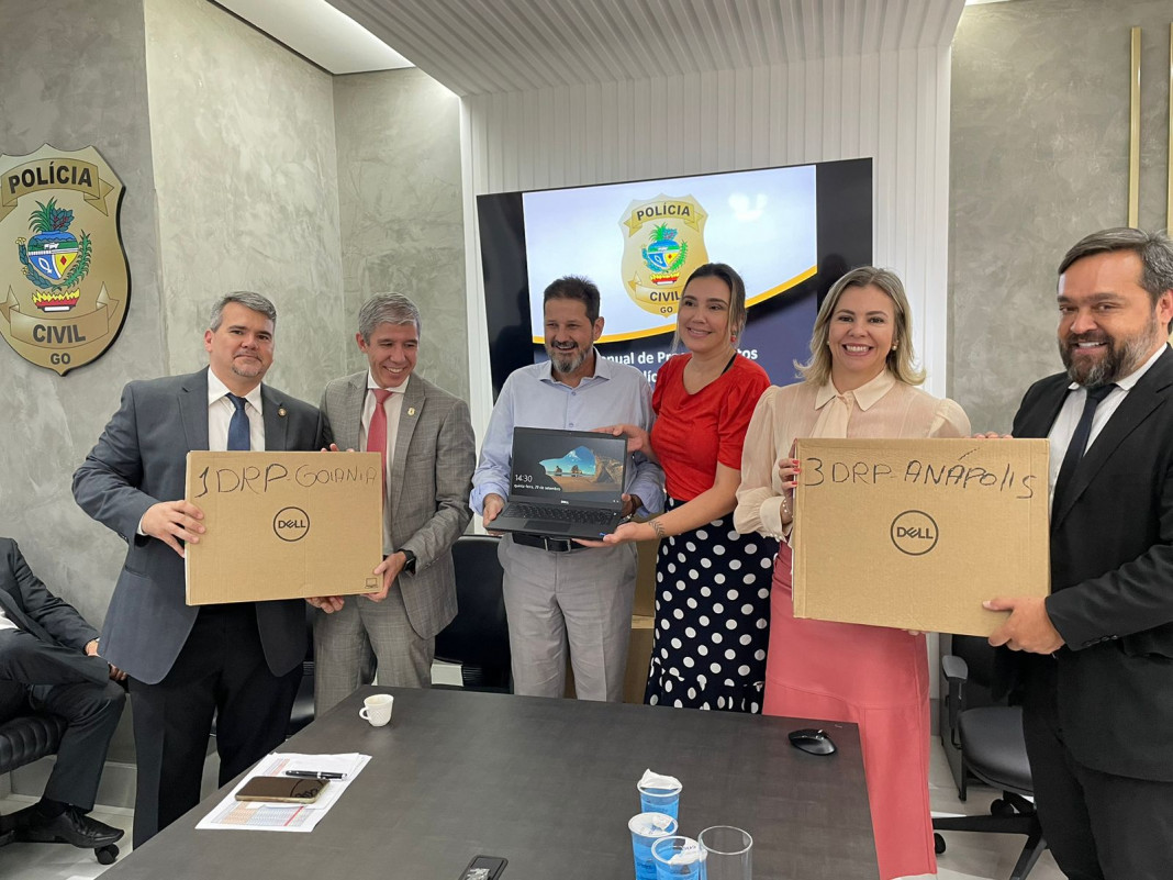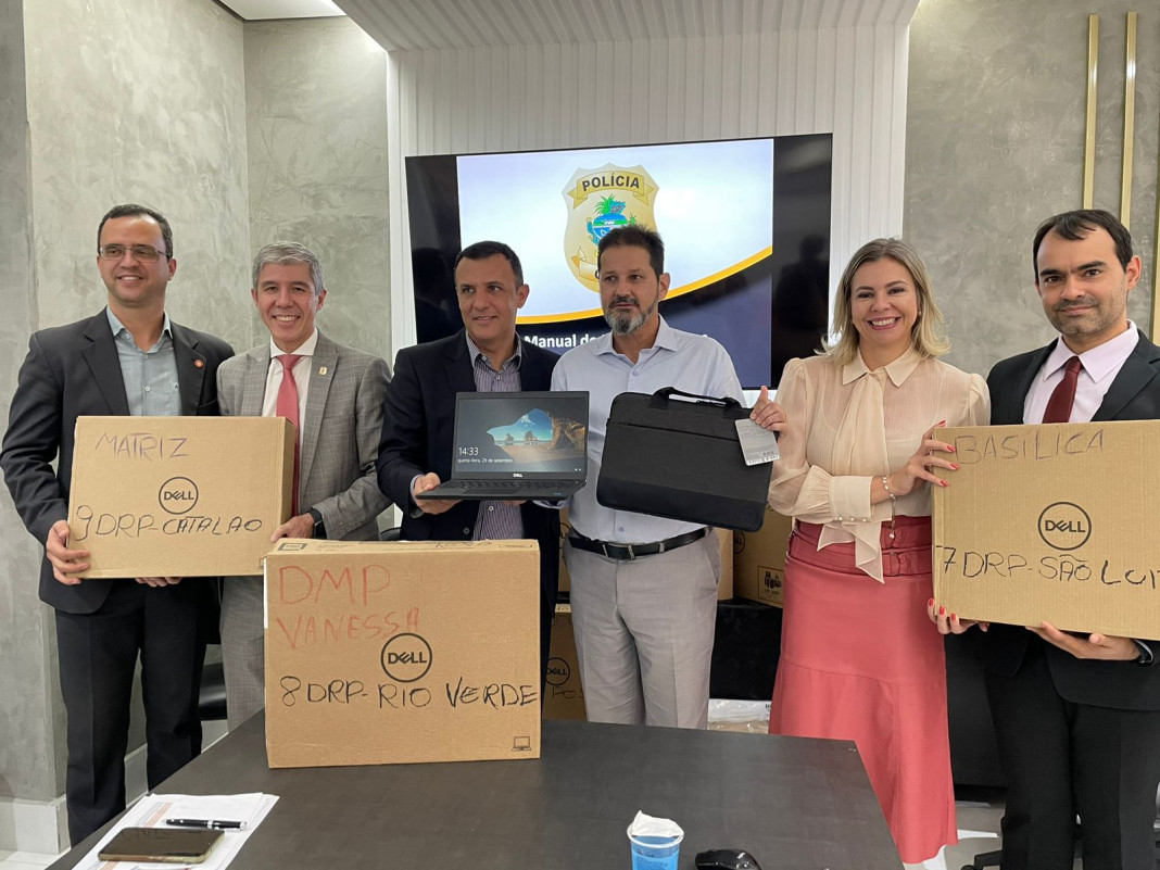 A Direção-Geral da Polícia Civil de Goiás entregou, na tarde da última quinta-feira (29/9), um total de 19 notebooks. Os equipamentos foram entregues aos delegados de cada unidade regional. Os computadores foram entregues pelo Delegado-Geral, Alexandre Lourenço, Delegado-Geral Adjunto, Reinaldo Koshiyama de Almeida, e pela Superintendente de Polícia Judiciária, Ana Claudia Rodrigues Stoffel. O equipamento servirá como suporte funcional, a fim de que as autoridades policiais possam acessar o sistema de procedimentos policiais remotamente. A previsão é de que, em breve, seja distribuído um total de 800 notebooks aos delegados para trabalho remoto e lavratura de flagrantes virtuais.