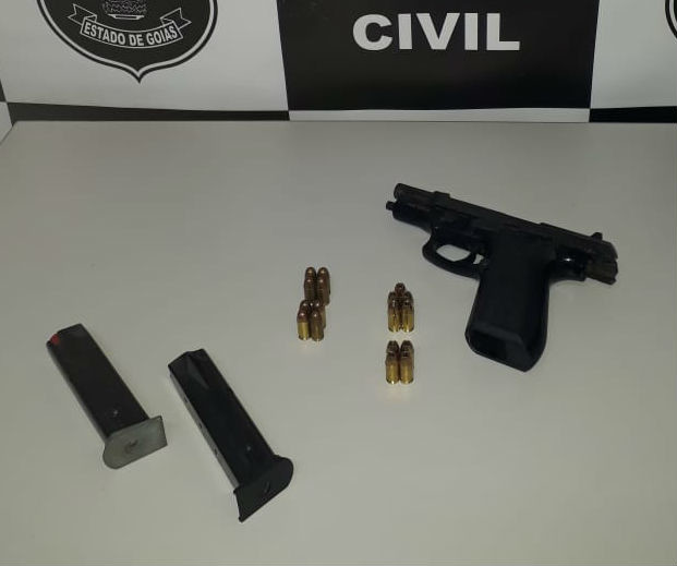 Diante das provas colhidas, foi representado ao Judiciário pela medida cautelar de busca, que foi autorizada, sendo que, durante a diligência, foi apreendida na residência do investigado uma arma de fogo tipo pistola, marca Taurus, calibre .380, com dois carregadores e várias munições.