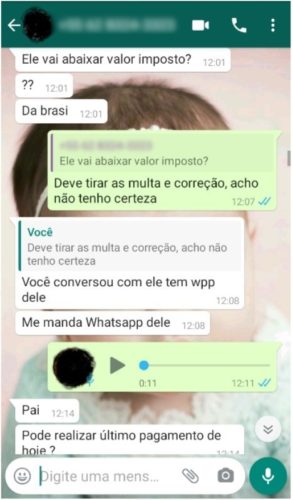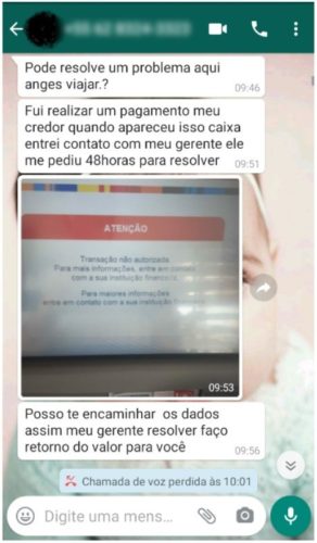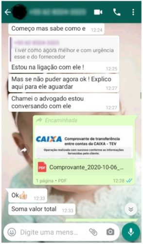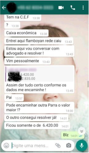 Após algumas trocas de mensagens, os criminosos que se identificaram como sendo o filho da vítima afirmaram que sua conta bancária estava bloqueada e, por isso, precisavam de auxílio financeiro dos pais. As vítimas então realizaram três transferências bancárias, que totalizaram R$ 15.898,00 (quinze mil oitocentos e noventa e oito reais).
