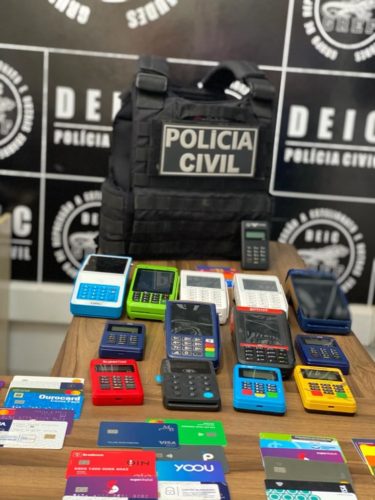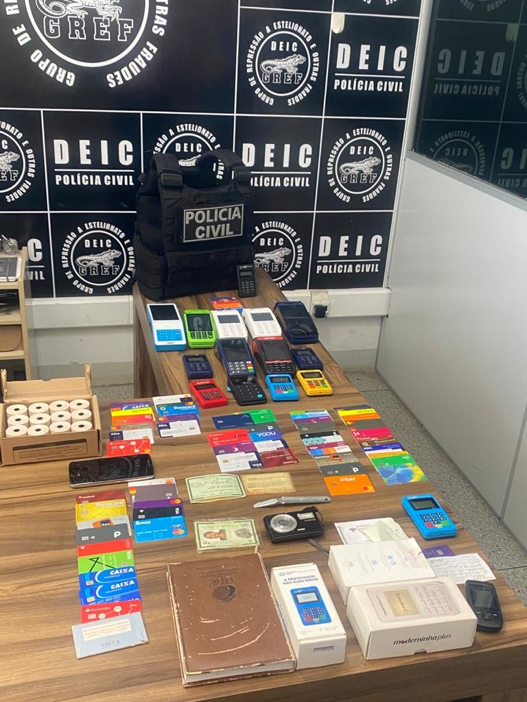 Na casa dos investigados, foram encontrados dezenas de cartões de titularidade de outras pessoas, além de maquinetas e máquinas de cartão de crédito utilizadas para gastar o limite das vítimas.