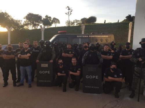 Ato contínuo, em operação integrada entre a Polícia Civil de Goiás, por meio da DERFRVA, e a Polícia Penal do Estado de Goiás, por meio do GOPE e da Unidade Prisional de Trindade, foram realizadas buscas nas celas vinculadas ao chefe do grupo criminoso investigado, sendo apreendidos uma arma de fogo, tipo revólver de calibre 38, 28 armas brancas, em especial facas, grande quantidade de substâncias entorpecentes e 60 aparelhos celulares.