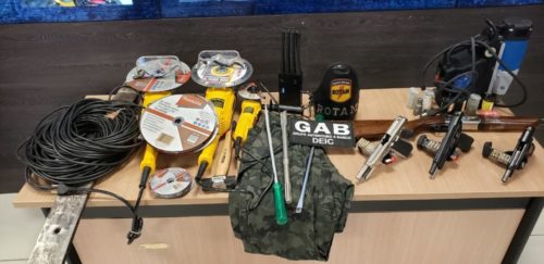 Entre o material apreendido, consta: 2 veículos utilizados na ação; 1 Gaugi 12; 1 Pistola cal .40; 1 Pistola cal 9mm; 1 Pistola cel 380, todas com munições específicas. Também foram encontradas diversas ferramentas utilizadas no corte de cofre bancário, como disco de corte e furadeira eletromagnética.