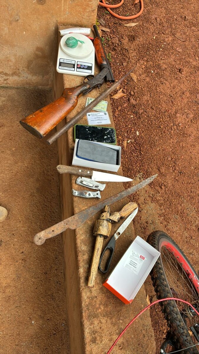 Durante o cumprimento dos mandados, os policiais apreenderam uma arma de fogo tipo espingarda (sem numeração aparente), uma balança de precisão, um rolo de filme PVC cortado, porção de substância semelhante à maconha e aparelhos celulares, entre os quais um telefone pertencente à vítima do roubo em Água Fria.