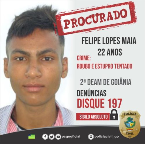 A Polícia Civil de Goiás realiza diversas diligências para cumprir o mandado de prisão preventiva de um investigado por roubo e tentativa de estupro. As buscas são feitas pela equipe da 2ª Delegacia Especializada no Atendimento à Mulher (DEAM) de Goiânia com apoio dos policiais civis da 1ª Delegacia Regional de Polícia (DRP), 22ª Delegacia Distrital e 1ª Deam. Os policiais procuram por Felipe Lopes Maia, 22 anos, suspeito de ter roubado e tentado estuprar duas mulheres em um salão de beleza no setor Parque Oeste Industrial, na manhã do dia 29 de janeiro deste ano, em Goiânia.
