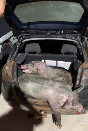 “Dentro do porta-malas pequeno do carro, foram encontrados dois porcos grandes ‘imprensados’. Os animais apresentavam várias lesões provenientes do transporte inadequado”, relata do delegado Leylton Barros.