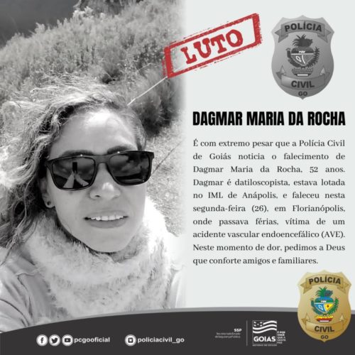 É com extremo pesar que a Polícia Civil de Goiás noticia o falecimento de Dagmar Maria da Rocha, 52 anos. Dagmar é datiloscopista, estava lotada no IML de Anápolis, e faleceu nesta segunda-feira (26), em Florianópolis, onde passava férias, vítima de um acidente vascular endoencefálico (AVE). Neste momento de dor, pedimos a Deus que conforte amigos e familiares.