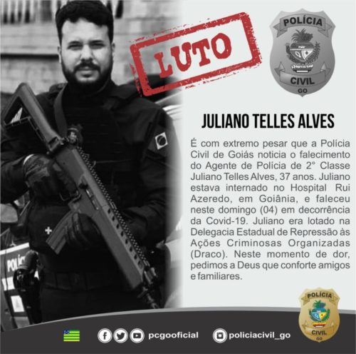 É com extremo pesar que a Polícia Civil de Goiás noticia o falecimento do Agente de Polícia de 2° Classe Juliano Telles Alves, 37 anos. Juliano estava internado no Hospital Rui Azeredo, em Goiânia, e faleceu neste domingo (04) em decorrência da Covid-19. Juliano era lotado na Delegacia Estadual de Repressão às Ações Criminosas Organizadas (Draco). Neste momento de dor, pedimos a Deus que conforte amigos e familiares.
