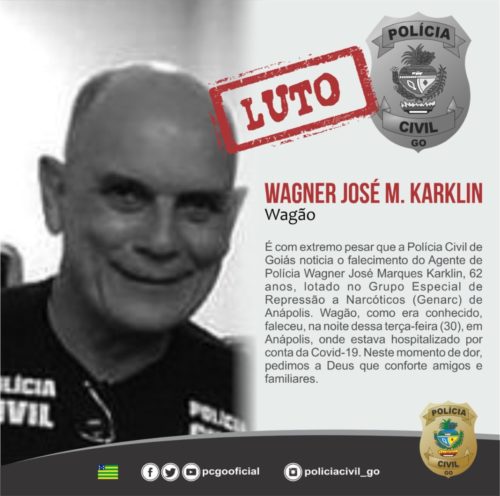 É com extremo pesar que a Polícia Civil de Goiás noticia o falecimento do Agente de Polícia Wagner José Marques Karklin, 62 anos, lotado no Grupo Especial de Repressão a Narcóticos (Genarc) de Anápolis. Wagão, como era conhecido, faleceu, na noite dessa terça-feira (30), em Anápolis, onde estava hospitalizado por conta da Covid-19. Ele serviu a Polícia Civil por 29 anos. Neste momento de dor, pedimos a Deus que conforte amigos e familiares.
