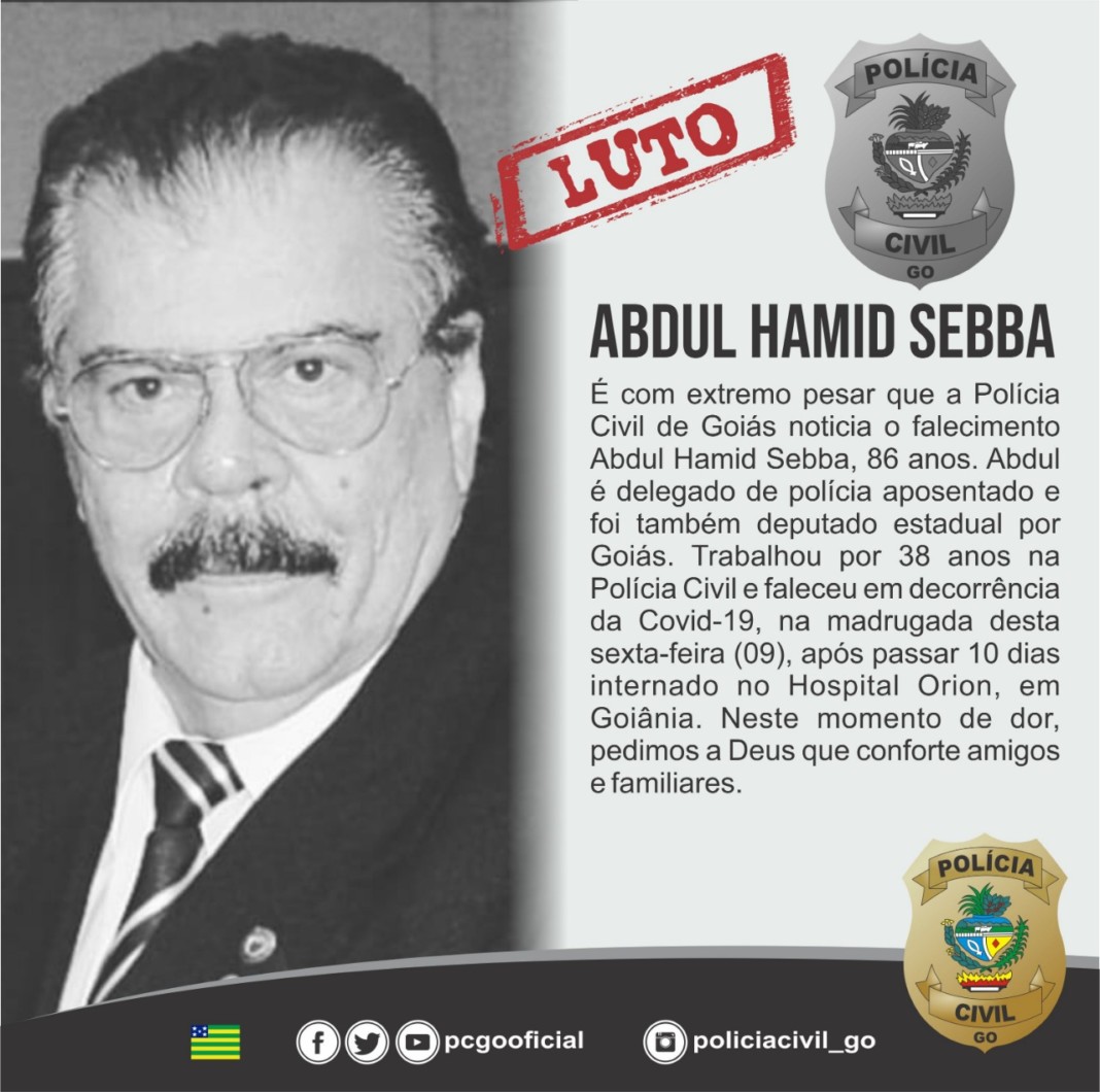 É com extremo pesar que a Polícia Civil de Goiás noticia o falecimento Abdul Hamid Sebba, 86 anos. Abdul é delegado de polícia aposentado e foi também deputado estadual por Goiás. Trabalhou por 38 anos na Polícia Civil e faleceu em decorrência da Covid-19, na madrugada desta sexta-feira (09), após passar 10 dias internado no Hospital Orion, em Goiânia. Neste momento de dor, pedimos a Deus que conforte amigos e familiares.