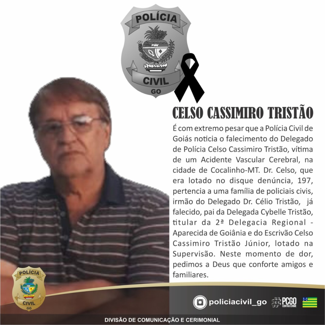 É com extremo pesar que a Polícia Civil de Goiás noticia o falecimento do Delegado de Polícia Celso Cassimiro Tristão, vítima de um Acidente Vascular Cerebral (AVC), ocorrido na cidade de Cocalinho (MT). Dr. Celso, que era lotado no Disque-Denúncia 197, pertencia a uma família de policiais civis, irmão do Delegado Célio Tristão, já falecido, pai da Delegada Cybelle Tristão, titular da 2a Delegacia Regional /Aparecida de Goiânia e do Escrivão Celso Cassimiro Tristão Júnior, lotado na Supervisão. Neste momento de dor, pedimos a Deus que conforte amigos e familiares.