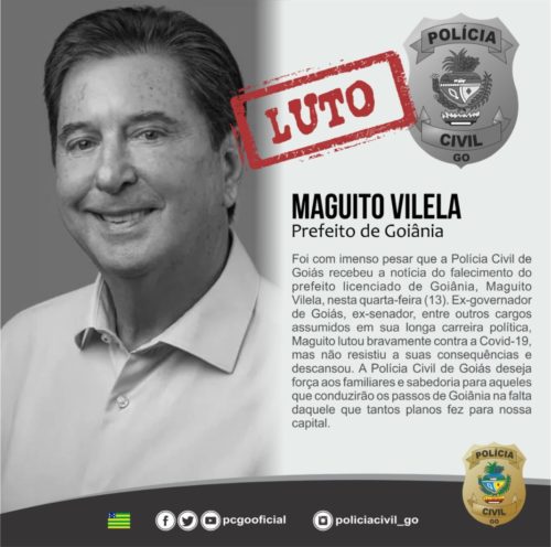 Foi com imenso pesar que a Polícia Civil de Goiás recebeu a notícia do falecimento do prefeito licenciado de Goiânia, Maguito Vilela, nesta quarta-feira (13). Ex-governador de Goiás, ex-senador, entre outros cargos assumidos em sua longa carreira política, Maguito lutou bravamente contra a Covid-19, mas não resistiu a suas consequências e descansou. A Polícia Civil de Goiás deseja força aos familiares e sabedoria para aqueles que conduzirão os passos de Goiânia na falta daquele que tantos planos fez para nossa capital.