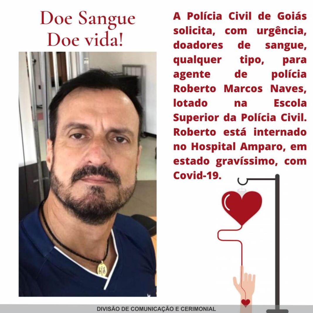 A Polícia Civil de Goiás solicita, com urgência, doadores de sangue, qualquer tipo, para agente de polícia Roberto Marcos Naves, lotado na Escola Superior da Polícia Civil. Roberto está internado no Hospital Amparo, em estado gravíssimo, com Covid-19.