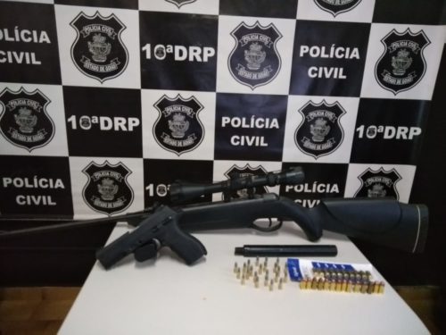 Na manhã de hoje, policiais civis compareceram no local e apreenderam, no quarto do investigado, duas armas de fogo: uma pistola, calibre .380 e uma espingarda, calibre .22, acoplada com luneta e silenciador, além de 47 munições calibres .22 e .380.