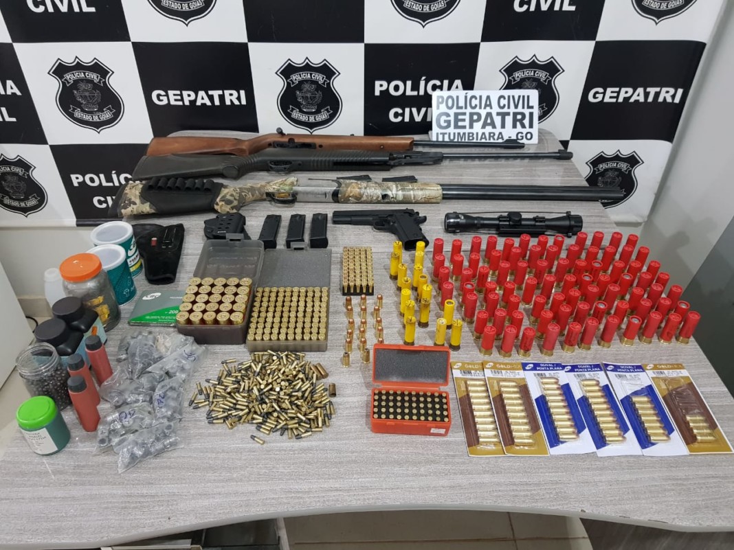 Durante o cumprimento de mandado de busca e apreensão, a equipe policial do Gepatri apreendeu quatro armas de fogo, além de centenas de munições e insumos para fabricação em uma propriedade rural localizada em Inaciolândia. Uma das armas, uma espingarda calibre 22, marca HATSAN, estava sem registro e atribuída como sendo de propriedade de um dos autuados, embora na posse de outra pessoa, além dos inúmeros insumos e munições.
