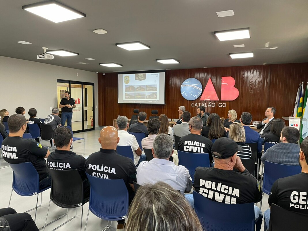 O Delegado-Geral da Polícia Civil de Goiás, Alexandre Pinto Lourenço, participou, na manhã de hoje (22/6), de mais uma edição do projeto Direção-Geral Participativa. Desta vez, o chefe da PCGO esteve em Catalão, sede da 9ª Delegacia Regional, onde se reuniu com policiais civis do local para traçar planos e metas da atuação da PCGO na região. Além disso, o encontro serviu também para que o Delegado-Geral ouvisse dos policiais sugestões e demandas a fim de otimizar a gestão administrativa. O encontro foi realizado a sede da OAB da cidade.