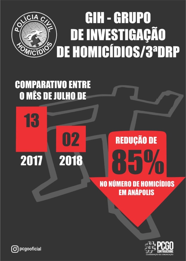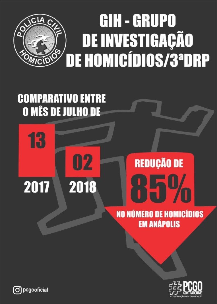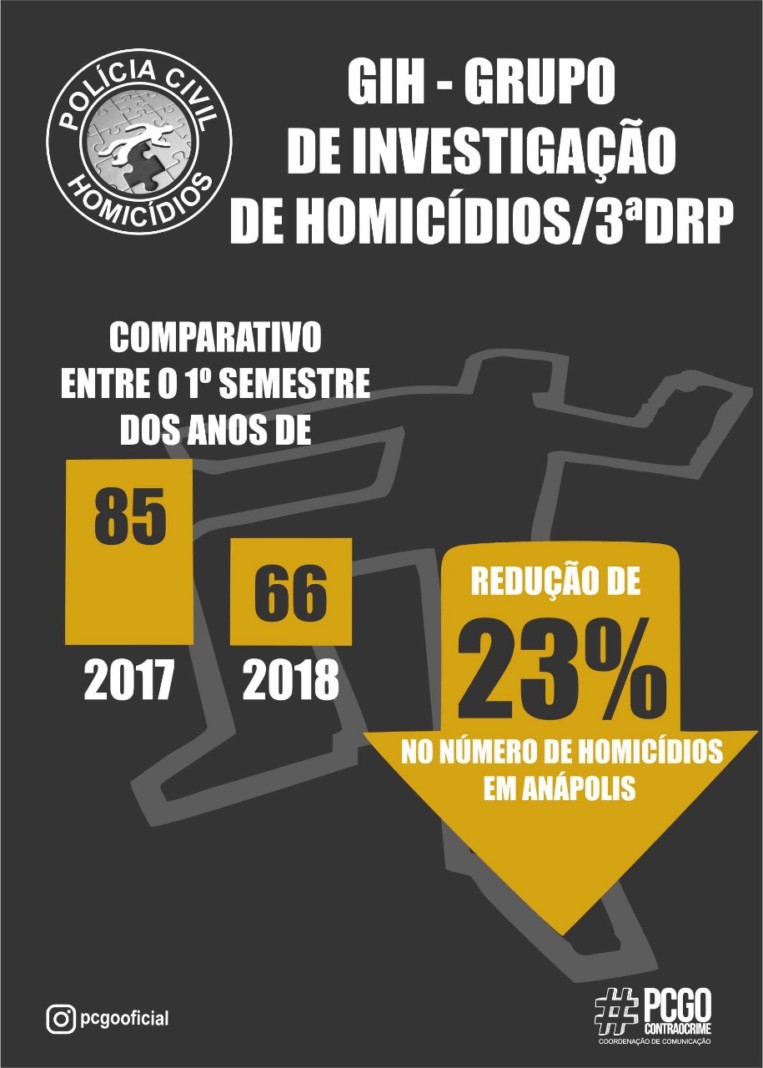 O número de homicídios reduziu 23% no primeiro semestre deste ano em relação ao mesmo período do ano passado na cidade de Anápolis. Os dados foram divulgados pelo Grupo de Investigação de Homicídios (GIH) da 3ª Delegacia Regional da Polícia Civil. Enquanto nos seis primeiros meses de 2017 ocorreram 85 assassinatos na cidade, este ano foram 66.