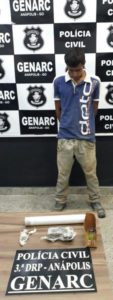 Policiais civis do Gepatri (Grupo Especial de Repressão a Crimes Patrimoniais) de Anápolis prenderam na noite desta quinta-feira (15/03) João Victor de Morais. De acordo com o delegado Daniel Nunes, os investigadores estavam realizando diligências no Setor Santo André, região sul de Anápolis, quando avistaram o homem repassando porções de maconha para dois usuários de drogas.