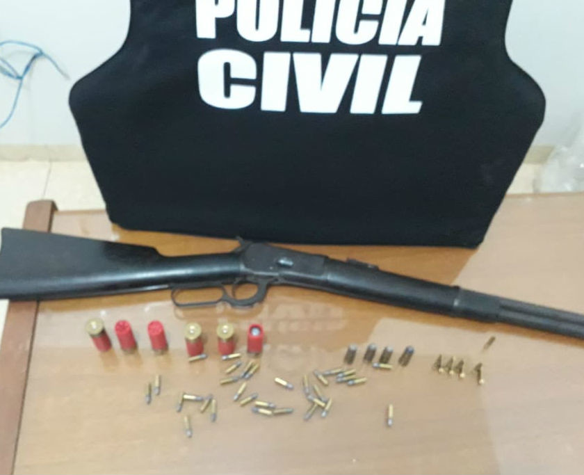 Durante o cumprimento do mandado de prisão e de busca e apreensão foi apreendida uma carabina calibre 44 e munições de três calibres diferentes. Renato foi autuado em flagrante delito pelo crime de posse irregular de arma de fogo de uso permitido e será recolhido ao Sistema Prisional.