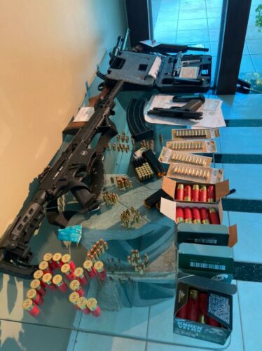 Na casa do investigado, foram encontrados: 2 espingardas calibre 12; 1 pistolete calibre 28; 1 pistola PT58 HCP; 1 pistola .40; 303 munições. Segundo a vítima, o investigado a ameaçou de morte com o uso de armas de fogo, motivo pelo qual a autoridade policial representou pela busca e apreensão das armas e munições. O investigado não foi preso em flagrante, pois apresentou registro das armas e seu registro como CAC, porém, segue sendo investigado pelos demais crimes no inquérito policial.