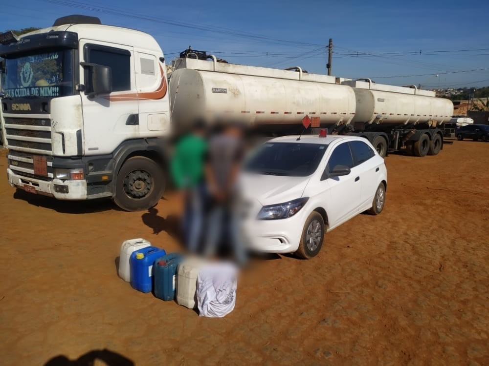 Por volta das 9h de hoje, os policiais civis prenderam em flagrante o motorista do caminhão e outro indivíduo retirando combustível do tanque do caminhões com galões de 20 litros. Foram apreendidos 100 litros de combustível e os autores foram autuados por furto qualificado e associação criminosa.