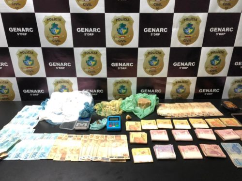 Em sua residência, foram encontrados grande quantidade de dinheiro, cocaína, crack, maconha e balança de precisão. O investigado já possui passagens por homicídio e tráfico de drogas no Estado de Goiás e no Distrito Federal, inclusive estava beneficiado em regime semiaberto e monitorado por tornozeleira eletrônica do Sistema Prisional. O autuado encontra-se recolhido na Unidade Prisional de Luziânia e permanecerá à disposição do Poder Judiciário.