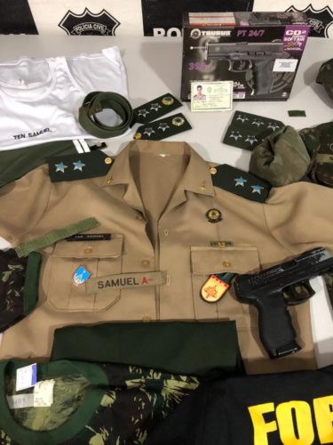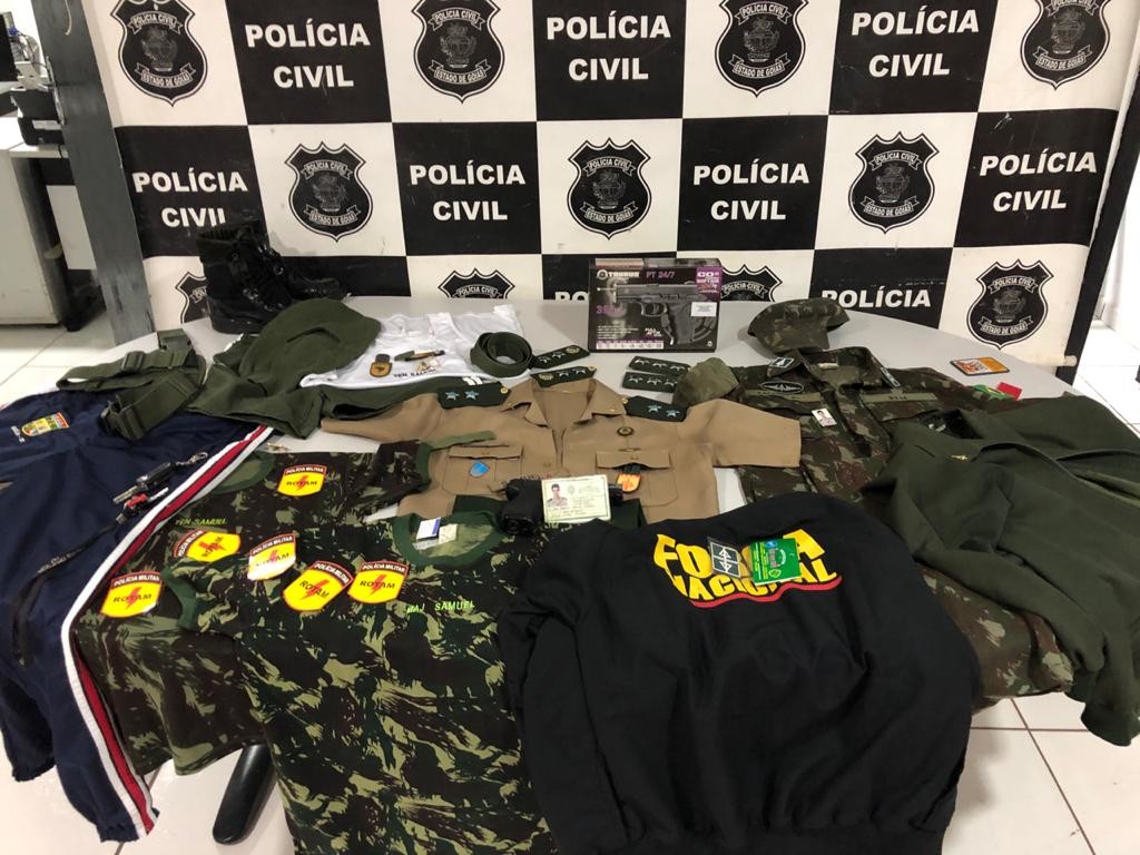 A Polícia Civil do Estado de Goiás, por meio da equipe da 1ª Delegacia Distrital de Polícia (DDP) de Valparaíso de Goiás, após investigação oriunda de várias denúncias, desencadeou operação nessa terça-feira (1º) que culminou na prisão em flagrante de uma pessoa. O indivíduo se passava por Oficial do Exército Brasileiro, inclusive trajando fardamento oficial da corporação. No momento da prisão, ele portava na cintura uma pistola de airsoft e apresentou à equipe uma carteira funcional falsa, com a patente de 1º Tenente.