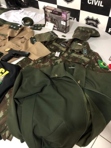 Além do simulacro, a equipe apreendeu, na residência do autuado, fardamentos completos, operacional, de passeio e de educação física do Exército Brasileiro, adesivos da Rotam, agasalho da Força Nacional e vários sutaches que fazem referência a cursos e condecorações militares. O indivíduo foi autuado em flagrante pelos crimes previstos nos Artigos 297 e 304 do Código Penal e se encontra preso à disposição do Poder Judiciário.
