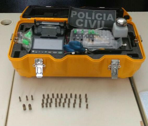 Em seu poder havia uma máquina de fusão de cabo de fibra óptica avaliada em R$ 11,5 mil. O objeto estava dentro do veículo no momento do roubo. O suspeito ainda possuía irregularmente 35 munições de arma de fogo.