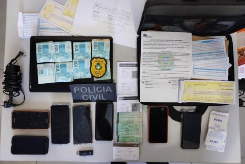 As equipes apreenderam 6 veículos automotores de diversas marcas, aparentemente adulterados, talões de notas promissórias, recibos de compra e venda, contratos falsos, documentos veiculares, diversos aparelhos celulares, notebook, pendrives, R$ 8 mil em espécie, cópias de cheques e outros documentos relacionados.
