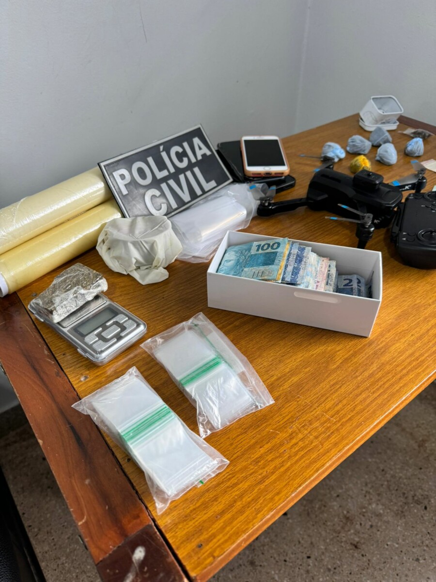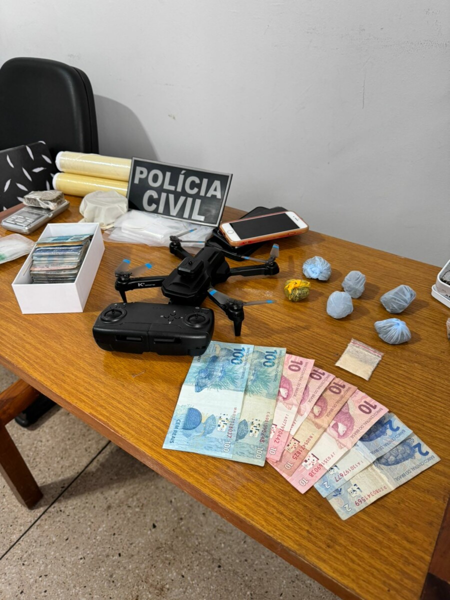 Durante o cumprimento das ordens judiciais, as equipes policiais lograram êxito em encontrar e apreender diversas porções de drogas ilícitas, balança de precisão, saquinhos ziplock, apetrechos utilizados para embalar entorpecentes, valores em espécie, vários aparelhos celulares e um drone que era utilizado no monitoramento pelo grupo criminoso.