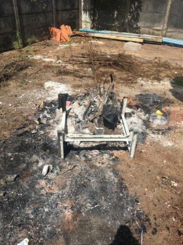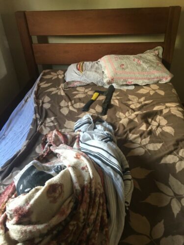 A equipe da Polícia Civil, durante diligência para retirada dos pertences pessoais da vítima na residência onde moravam, constatou que as roupas dela, de seus filhos, documentos pessoais e uma máquina de costura utilizada por ela haviam sido incinerados no quintal, sendo possível sentir o calor e o forte odor de álcool que emanava das cinzas dos objetos incendiados. Foram encontrados, sobre a cama do casal, uma machadinha e um facão devidamente afiados. Segundo a vítima, no dia anterior, o agressor teria se dirigido até a residência de sua mãe, onde ela estava morando, ordenando para que ela fosse até o lar conjugal buscar suas coisas. O agressor ainda proferiu insultos contra a vítima. A autoridade policial, além do flagrante, representou pela prisão preventiva do agressor.