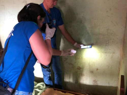 Diante do cenário extremo de violência física e psicológica e do risco contínuo à integridade corporal e a própria vida da vítima, as lesões foram filmadas pela equipe, subsidiando a representação pela prisão preventiva do agressor e por buscas na residência do casal, resultando numa rápida decisão do Poder Judiciário pela expedição dos mandados. De posse dos mandados, os policiais civis rapidamente localizaram e prenderam o agressor em seu local de trabalho, tendo posteriormente realizado buscas na residência do casal, que foi submetida a exame pericial. Por ocasião da perícia criminal, realizada pela Polícia Técnico-Científica, vestígios de sangue humano foram localizados em diversos pontos da casa, além de um amortecedor de motocicleta, pesando cerca de 1,5 kg, utilizado para golpear a vítima.