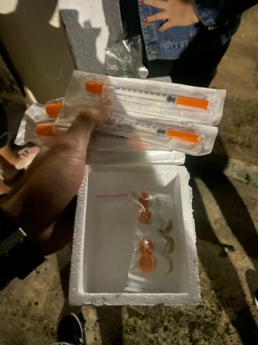 Após a identificação, os suspeitos passaram a ser monitorados, a fim de confirmar o teor da denúncia. Em determinado momento, foi possível flagrar uma suposta entrega dos medicamentos, ocasião em que, diante da justa causa, a equipe realizou a abordagem do veículo, sendo encontradas duas caixas de isopor contendo quatro recipientes de tirzepatida 15 mg.