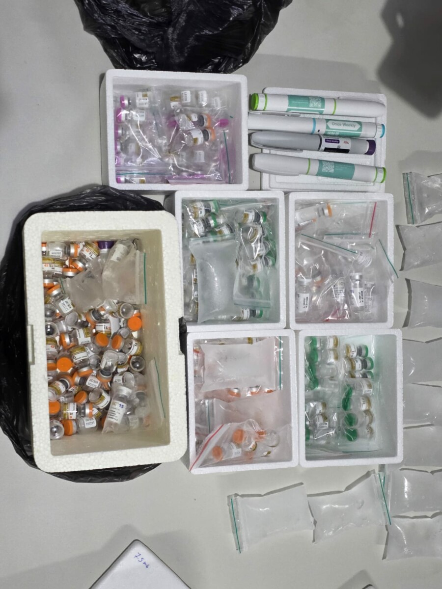 Após a identificação, os suspeitos passaram a ser monitorados, a fim de confirmar o teor da denúncia. Em determinado momento, foi possível flagrar uma suposta entrega dos medicamentos, ocasião em que, diante da justa causa, a equipe realizou a abordagem do veículo, sendo encontradas duas caixas de isopor contendo quatro recipientes de tirzepatida 15 mg.