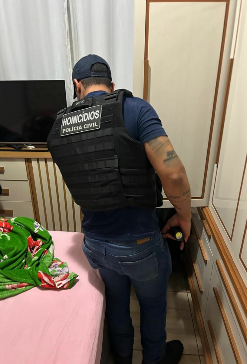 Buscas também foram realizadas em imóvel residencial do investigado, para a localização da arma de fogo utilizada no crime, sendo apreendidos objetos de interesse da investigação.