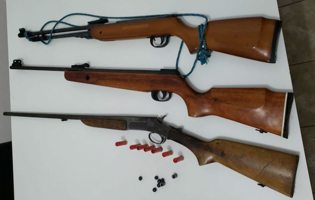 Deste modo, as forças de segurança de imediato foram até a residência do suspeito, onde, durante busca, localizaram três espingardas, sendo duas adaptadas para calçar munição calibre .22 e uma calibre .32.