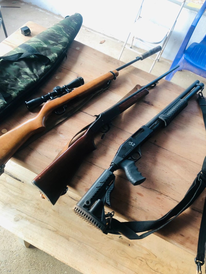 No local, os policiais civis apreenderam três armas de fogo, sendo uma espingarda calibre .22 (com mira e supressor de ruído), uma espingarda calibre .26 e uma espingarda calibre .12, além de diversas munições dos mesmos calibres. Na ocasião, não foi localizado o morador ou responsável. As armas e munições apreendidas serão periciadas a fim de se prosseguir na conclusão das investigações.