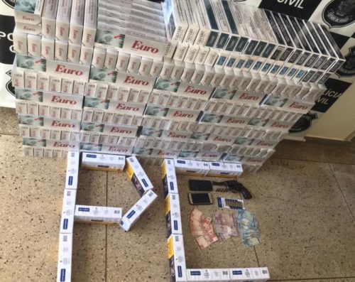 Realizado trabalho de campo e identificado o alvo, a equipe da Polícia Civil abordou nessa quarta-feira (20) o veículo na porta da residência de um dos indivíduos, quando retornava para casa. Realizada busca, os policiais civis encontraram, no banco de trás, algumas caixas de cigarros nacionais e importados, acompanhadas de anotações diversas relacionadas à comercialização dos produtos. Dentro da residência, foram encontradas outras caixas recheadas dos mesmos produtos, além de um revólver Taurus, calibre .38, sem registro e 15 munições intactas.