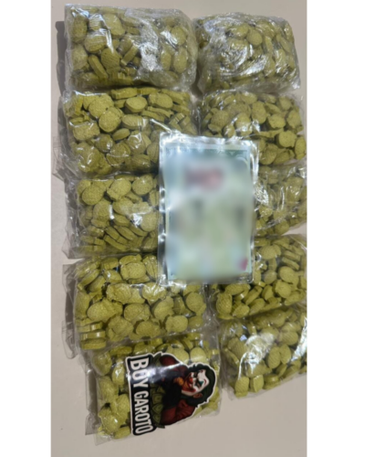 Durante a averiguação, foi encontrada no interior da bolsa uma cédula de identidade (RG), além de uma caixa nas cores preta e vermelha contendo dez pacotes transparentes com comprimidos, aparentemente da substância conhecida popularmente como “ecstasy”. Conforme levantamento preliminar, o material apreendido totaliza aproximadamente 1.000 porções da droga.