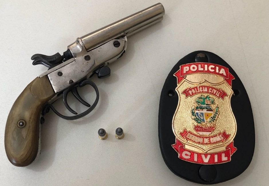 Policiais Civis de Uruana, com apoio da Delegacia de Polícia (DP) de Ceres, coordenados pelo delegado Matheus Costa Melo, apreenderam, na manhã de quinta-feira (30), uma arma de fogo tipo garrucha da marca Rossi calibre 22 sem registro na residência de um comerciante da cidade.