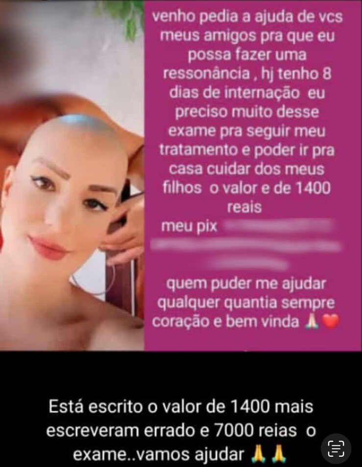 Diversas vítimas compareceram na delegacia de polícia e relataram que ajudaram a investigada financeiramente, para que ela conseguisse comprar remédios e realizar exames, mas que começaram a desconfiar da veracidade da sua doença. Foi possível averiguar também que campanhas e rifas foram realizadas para arrecadação de dinheiro, de forma a auxiliá-la no tratamento.