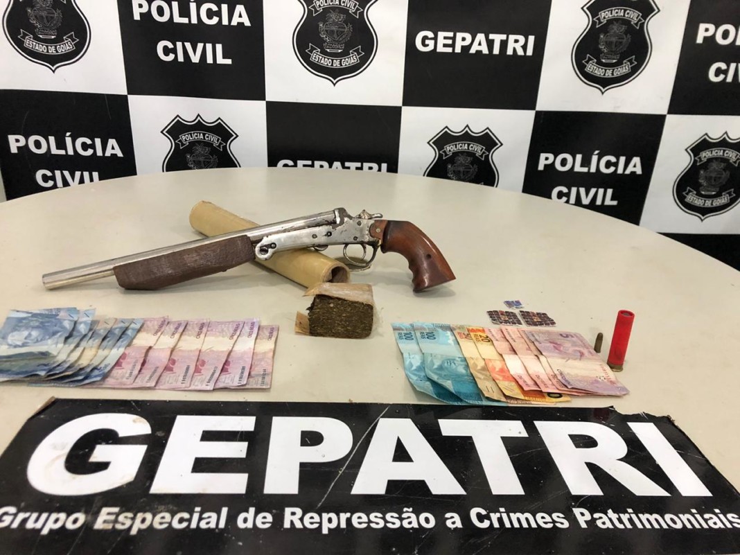 A Polícia Civil de Goiás, por meio do Grupo Especial de Repressão a Crimes Patrimoniais (Gepatri) de Rio Verde, em conclusão a investigação referente a crime de estelionato, prendeu em flagrante nessa quinta-feira (22), dois homens, sendo um por tráfico de drogas e outro por posse irregular de arma de fogo e estelionato. No dia anterior, um homem, se passando por comprador de um celular avaliado R$ 1.500,00, contatou a vítima dizendo estar interessado no aparelho de celular anunciado em grupos da rede social Facebook. No momento em que se encontraram, o homem disse ter efetuado um depósito na conta da vítima, no entanto, após o golpista ter ido embora, a vítima constatou que o comprovante era falso.