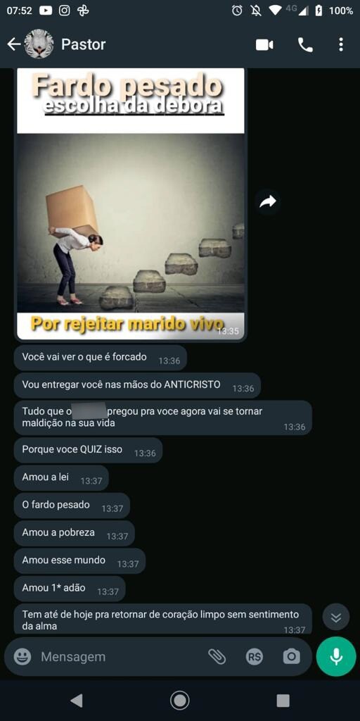 Em conversas de WhatsApp, após os fatos, na intenção de praticar novos atos libidinosos, mesmo com a negativa da vítima, o autor proferiu diversas ameaças religiosas à vítima e sua família. O pastor se autodenominava como “Yahuha” (Deus) e praticava verdadeiro terror psicológico contra a vítima, afirmando que seu marido “seria recolhido (morto a mando de Deus)”, que a vítima não seria salva, nem sua filha, que se o rejeitasse, seria punida por Deus.