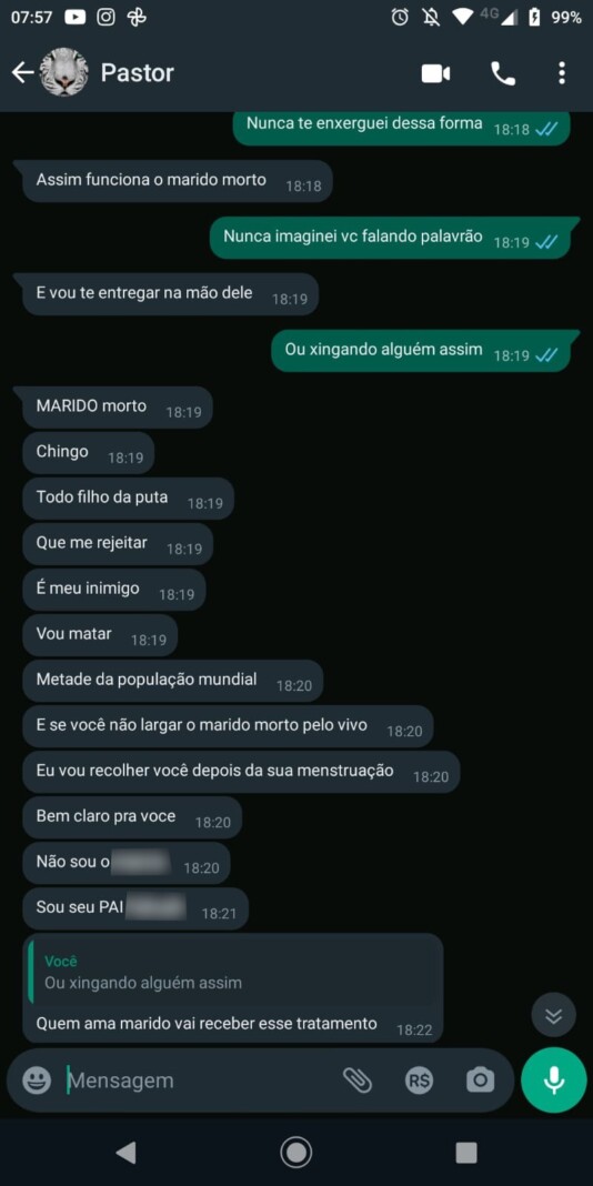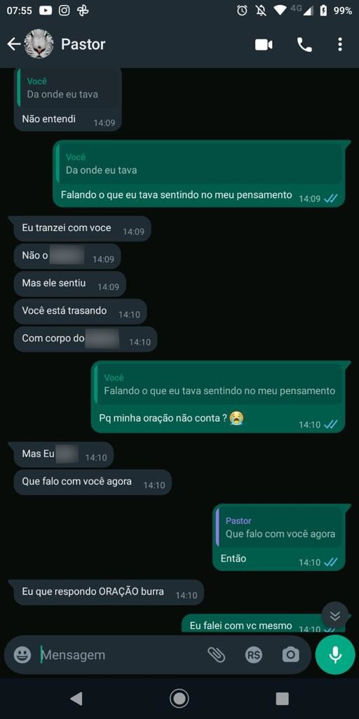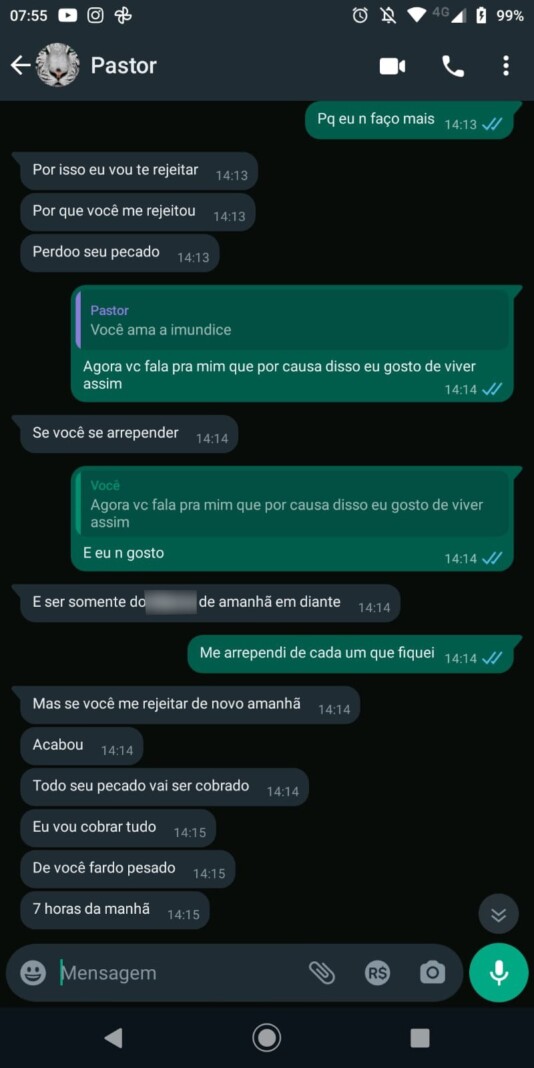Em conversas de WhatsApp, após os fatos, na intenção de praticar novos atos libidinosos, mesmo com a negativa da vítima, o autor proferiu diversas ameaças religiosas à vítima e sua família. O pastor se autodenominava como “Yahuha” (Deus) e praticava verdadeiro terror psicológico contra a vítima, afirmando que seu marido “seria recolhido (morto a mando de Deus)”, que a vítima não seria salva, nem sua filha, que se o rejeitasse, seria punida por Deus.