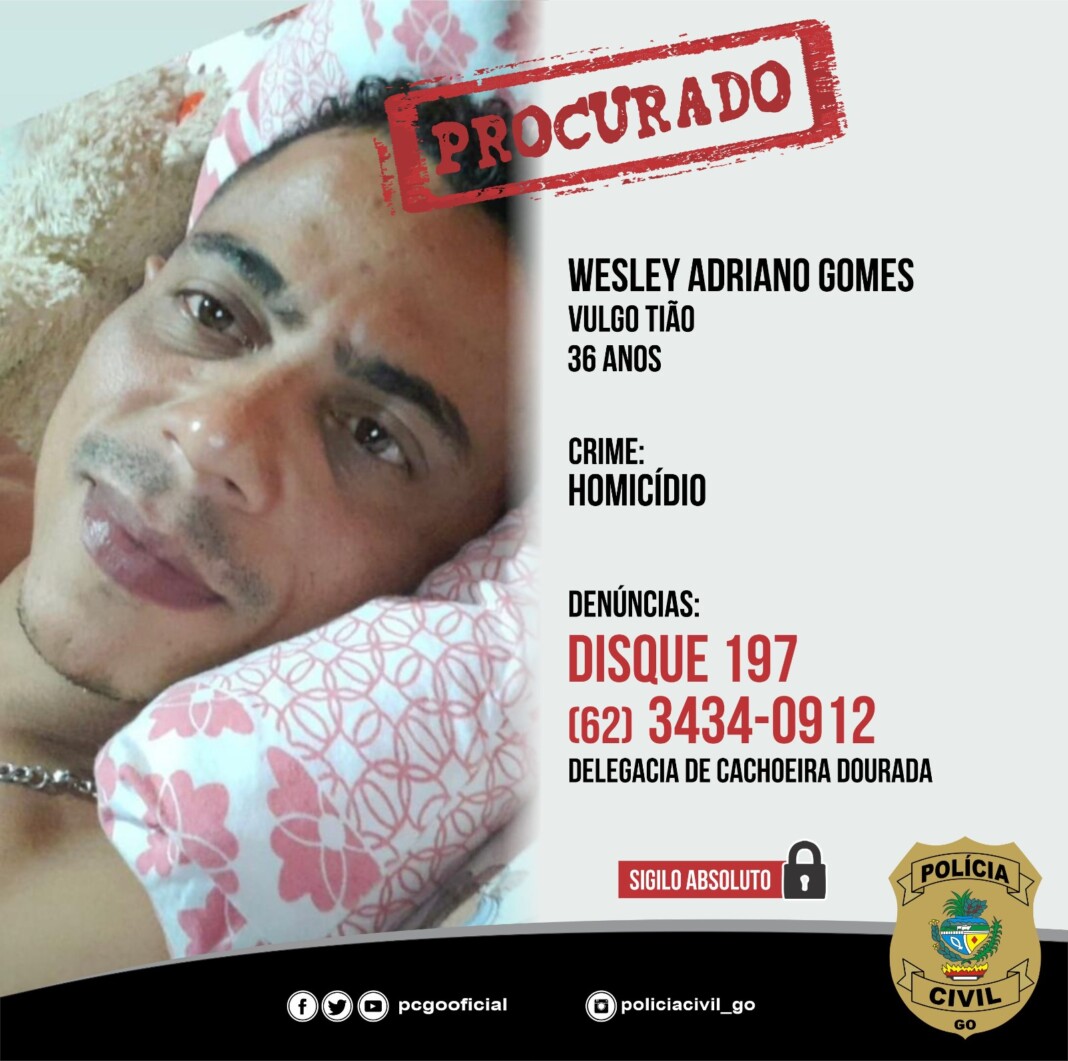 A Polícia Civil de Goiás, por meio da Delegacia de Cachoeira Dourada, procura um foragido da Justiça pelo crime de homicídio. Wesley Adriano Gomes, vulgo “Tião”, de 36 anos, é procurado em razão de mandado de prisão expedido pelo juízo de Cachoeira Dourada.