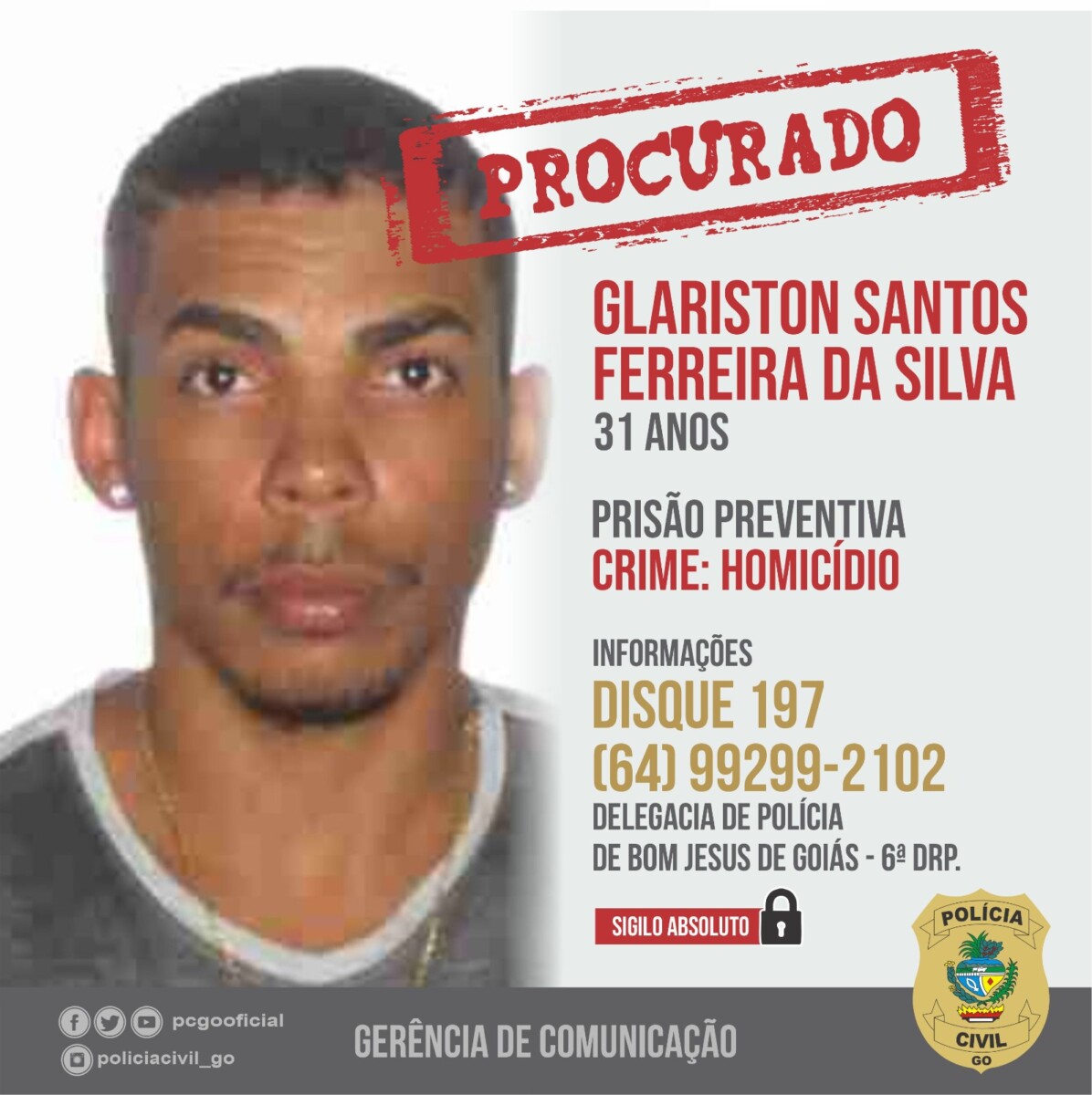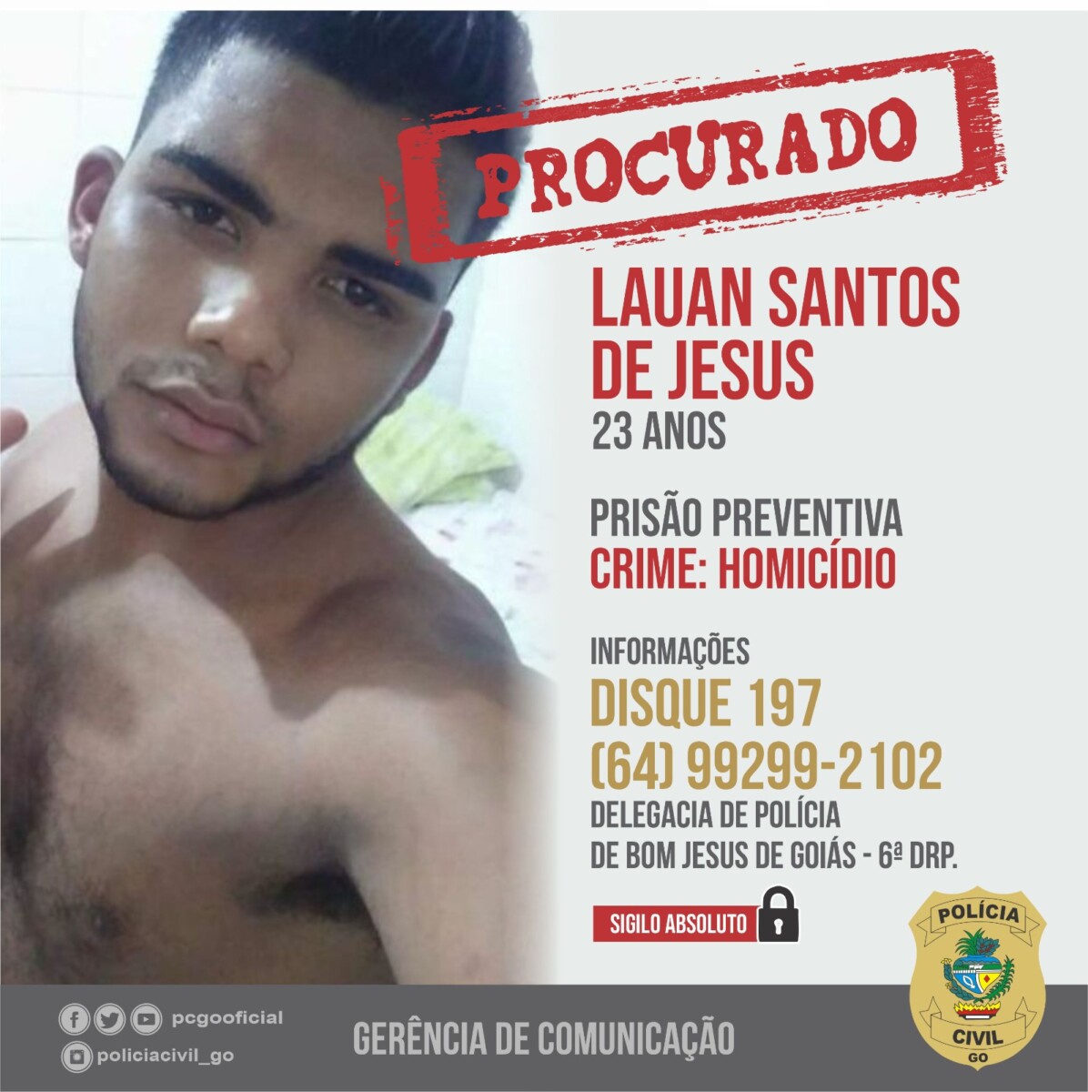 A Polícia Civil, por meio da Delegacia de Bom Jesus de Goiás, procura por Glariston Santos Ferreira da Silva e Lauan Santos de Jesus, acusados de terem praticado o crime de homicídio. O fato ocorreu no dia 8 deste mês de abril, quando um jovem foi morto na Praça da Bíblia, centro da cidade de Bom Jesus. Em menos de 3h após o ocorrido, os policiais civis identificaram a dupla autora do delito e autoridade policial representou pela prisão preventiva deles.