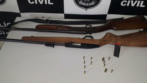 Durante as diligências, foram apreendidas em poder do suspeito L. E. C. R., de 68 anos de idade, duas espingardas, sendo uma CBC calibre .22 e uma tipo cartucheira calibre .36, além de 12 munições.