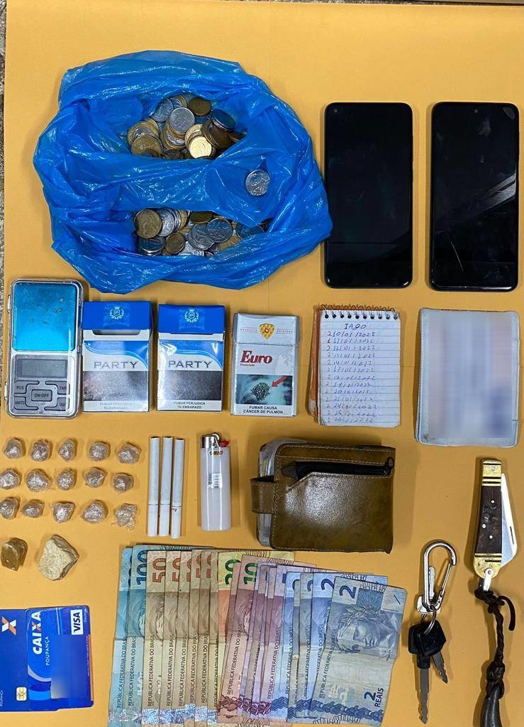 Posteriormente, foram realizadas buscas na residência do autor dos fatos, onde, sob autorização verbal, foram encontrados mais três pedras maiores, sem invólucro, acondicionadas dentro de um maço vazio de cigarro, bem como uma balança de precisão, caderno para anotações da contabilidade do tráfico e quantia significativa de dinheiro em espécie.